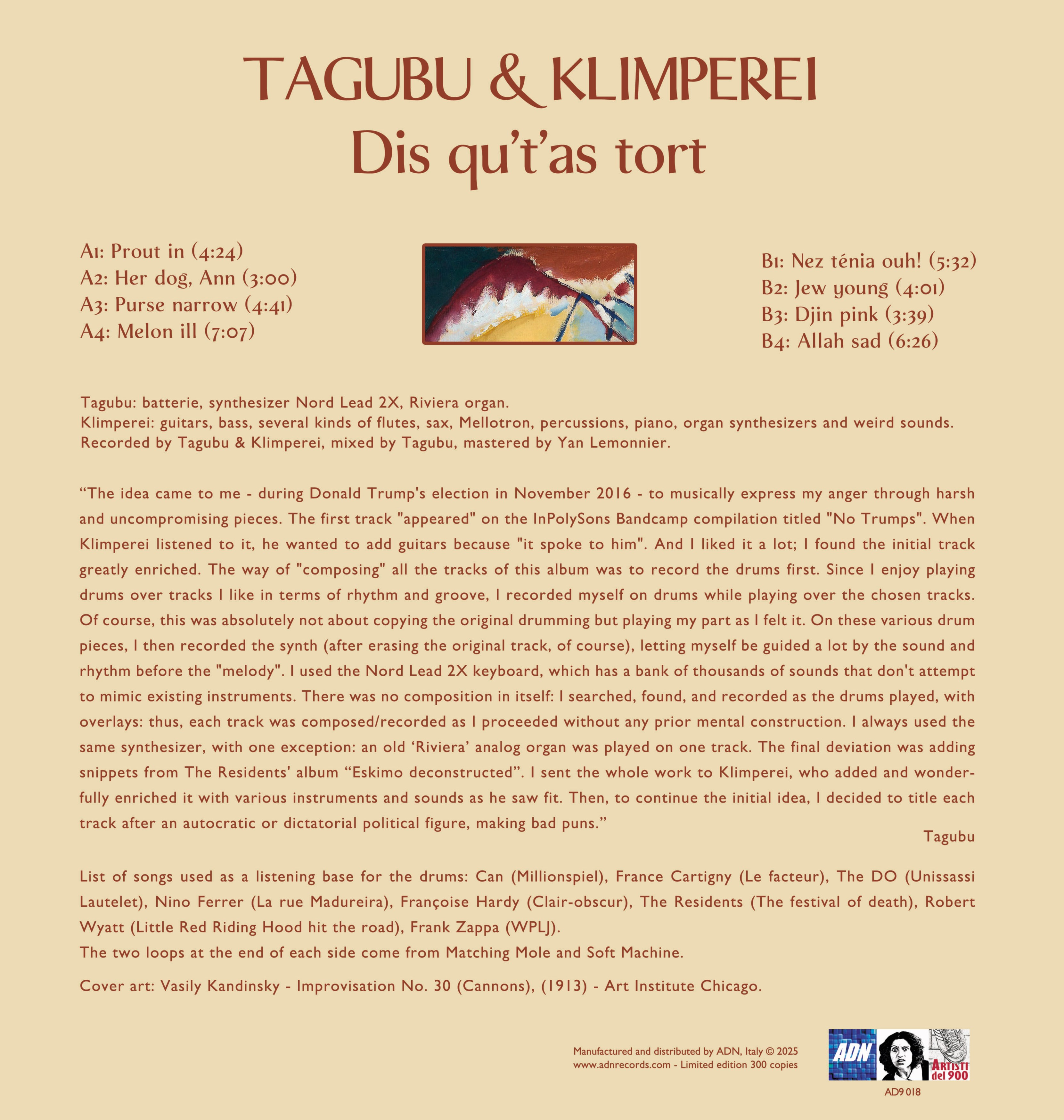 Tagubu: drums, synthesizer Nord Lead 2X, Riviera organ.